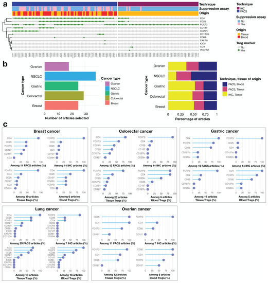 We evaluated the degree of consensus concerning the definition of Tregs, by pooling all articles for the five cancer types considered, a total of 130 publications (23 for breast, 28 for colorectal, 24 for gastric, 35 for lung and 20 for ovarian cancers. See Methods for article selection, Supplementary Table S1 and Figure 1).