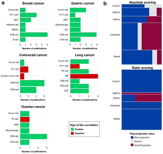 Several articles investigated the correlation between Tregs and other cell populations from the same environment. This approach was used in 36% of the articles on breast cancer, 23% of those on colorectal cancer, 34% of those on gastric cancer, 19% of those on lung cancer and 29% of those on ovarian cancer. CD8 T cells were always positively associated with Tregs, regardless of cancer type, and most articles looking at neighboring cells measured this association. The same positive correlation was found for tumor cells, CD3 cells, cancer-associated fibroblasts (CAFs), follicular helper T cells (Tfh) and predendritic cells (DCs), across cancer types. Positive correlations with other cell types, such as myeloid cells, including myeloid-derived suppressor cells (MDSCs), macrophages and tumor-associated macrophages (TAMs), were described in just one article on breast cancer and one on ovarian cancer. Natural killer cells (NKs) and Th17 cells were negatively correlated with Tregs in one and three lung cancer studies respectively, as well as FOXP3 tumor cells in one colorectal cancer article (Figure 4a).