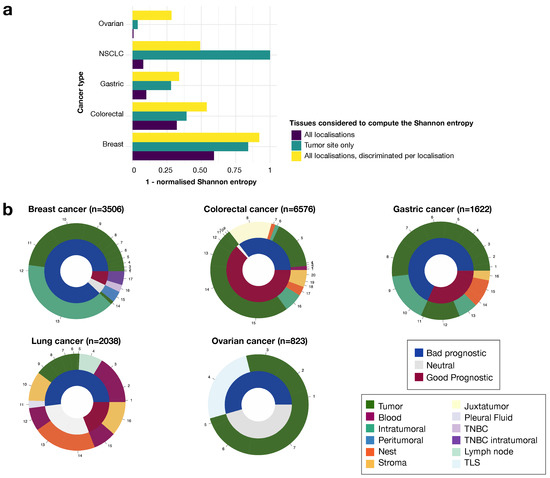 Finally, we also studied the role of Tregs detected in the patients’ peripheral blood or directly in the diseased organ, and even in specific parts of the tumor. There was no standardized way to name the different parts of the tumor. We therefore merged the various denominations used by the authors: intra-epithelial (or nest) vs. stroma, intratumoral vs. peritumoral. The “nest” was defined as the cells surrounded by cancer cells, whereas the “stroma” designated cells from the tumor stroma, i.e., patches of cells almost free of cancer cells within the tumor. “Peritumoral” was used to describe cells at the margin, whereas “intratumoral” was used to describe cells at the center of the tumor. We assessed the degree of consensus, as described in the Section 2, and we observed that the agreement on prognosis for each individual anatomic site was better than that for all anatomic sites together or for the non-segmented piece of tumor (Figure 5a). Overall, we found that anatomic site was a crucial parameter to understand the role of the Treg population in each cancer type, because entropy increased strongly when we took anatomic site into account in our evaluation of prognostic value (Figure 5a, Supplementary Figure S5). In particular, for lung cancer, the strongest consensus was obtained only when the whole piece of tumor was taken into account. This reflects the higher degree of discrepancy in prognosis assessment based on blood Tregs, with most lung cancer studies being based on blood Treg detection. We suspect that the particularly high level of ambiguity for blood results is due to the Tregs from blood samples being identified by FACS, for which there is less consensus about the most appropriate markers than for IHC. We also suspect that blood samples do not reflect the TIME as well as tissue samples, therefore providing a less accurate representation of the tumor context [38,39].