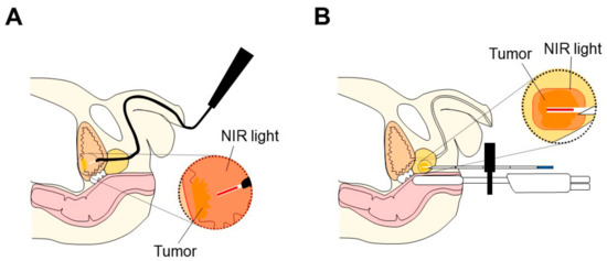 Scheme for NIR light irradiation to treat bladder and prostate cancer. NIR light is irradiated to a bladder tumor using a cylindrical diffuser via a cystoscope (A). NIR light is irradiated to a prostate tumor using a cylindrical diffuser via a needle (B).