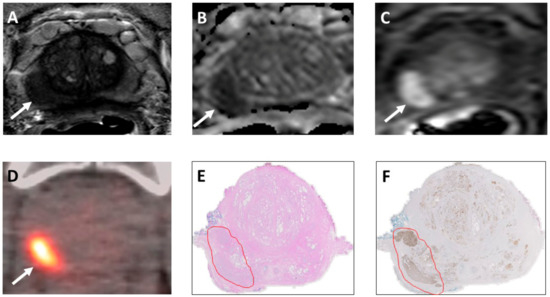 71-year-old male patient with a serum PSA of 5.2 ng/mL. Axial T2-weighted (T2W) MRI shows a hypointense lesion in the right base peripheral zone (arrow) (A), which shows diffusion restriction on apparent diffusion coefficient (ADC) map (arrow) (B) and early focal enhancement on dynamic contrast enhanced (DCE) MRI (arrow) (C). 18-F-DCFPyL PET/CT shows focal uptake within the right-sided lesion (arrow) (D). Hematoxylin-eosin (HE) histopathology slide confirms presence of Gleason 4 + 4 prostate cancer within this lesion (inked in red) (E). PSMA immunohistochemistry (IHC) staining shows selective PSMA expression within the right base peripheral zone lesion (inked in red) (F).