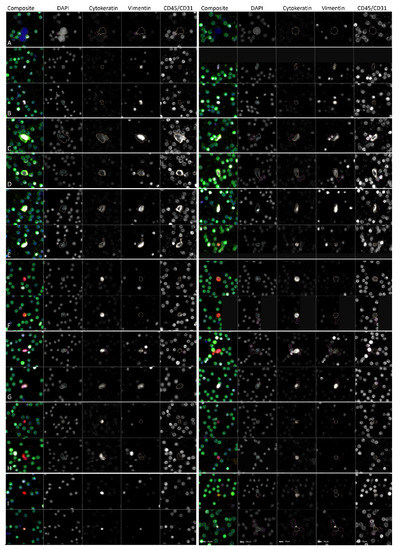 For rare-event analysis, each test included two slides per sample. In this study, there was an average of 1.3 mL of blood analyzed per test. Slides were stained at room temperature using the IntelliPATH FLXTM autostainer (Biocare Medical LLC, Irvine, CA, USA), as previously described [24,25], with 2.5 ug/mL of a mouse IgG1 anti-human CD31:Alexa Fluor® 647 mAb (clone: WM59, MCA1738A647, BioRad, Hercules, CA, USA) and 100 ug/mL of goat anti-mouse IgG monoclonal Fab fragments (115–007- 003, Jackson ImmunoResearch, West Grove, PA, USA), permeabilized using 100% cold methanol, followed by an antibody cocktail consisting of mouse IgG1/Ig2a anti-human cytokeratins (CKs) 1, 4, 5, 6, 8, 10, 13, 18, and 19 (clones: C-11, PCK-26, CY-90, KS-1A3, M20, A53-B/A2, C2562, Sigma, St. Louis, MO, USA), mouse IgG1 anti-human CK 19 (clone: RCK108, GA61561–2, Dako, Carpinteria, CA, USA), mouse anti-human CD45:Alexa Fluor® 647 (clone: F10–89-4, MCA87A647, AbD Serotec, Raleigh, NC, USA), and rabbit IgG anti-human vimentin (Vim) (clone: D21H3, 9854BC, Cell Signaling, Danvers, MA, USA). Lastly, slides were incubated with Alexa Fluor® 555 goat anti-mouse IgG1 antibody (A21127, Invitrogen, Carlsbad, CA, USA) and 4′,6-diamidino-2-phenylindole (DAPI; D1306, ThermoFisher, Waltham, MA, USA) prior to being mounted with a glycerol-based aqueous medium. Automated high-throughput fluorescence scanning microscopy at 10× objective magnification was then used to obtain 2304 frame images per fluorescence channel per side.