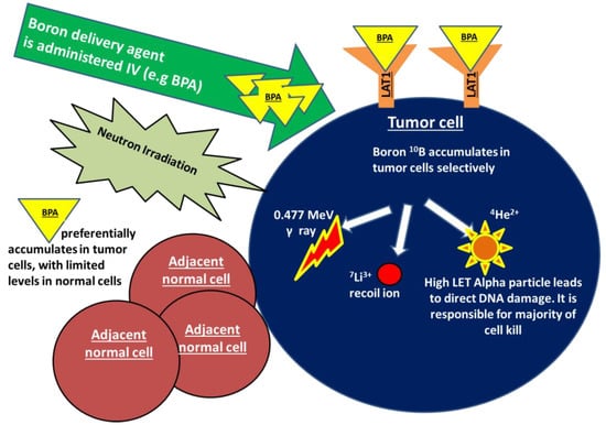Boron neutron capture (BNCT) is an emerging radiation treatment modality that is aimed at improving tumor control while limiting damage to normal tissues. BNCT falls under the category of high linear energy transfer (high-LET) radiation, which is a form of densely ionizing radiation that causes clustered, irreparable direct DNA damage in a less oxygen dependent manner, in comparison to traditional low-LET X-ray-based therapies. Treatment with BNCT involves the targeted delivery of boronated compounds to tumor cells, followed by the irradiation of tumors with epithermal neutrons. The interaction of the nonradioactive boron-10 atoms (10B) with thermalized neutrons causes a nuclear capture and fission reaction, leading to the production of a high LET, low energy, alpha particle and a recoil lithium-7 atom (10B + 1n → [11B]* → 4He + 7Li). Given the densely ionizing nature of these high-LET particles, the biological impact of BNCT on tumor cells, compared to a reference radiation type such as X-rays, is expected to be higher. As the high LET particles deposit their energy within a radius of <10 μm, the resulting DNA damage only occurs within the diameter of a single tumor cell, largely sparing adjacent normal tissues. The dense ionization tracks produced along the DNA by high-LET radiation has been shown to produce greater DNA double strand breaks in comparison to low-LET counterparts. Additionally, studies indicate that the clustered DNA damage produced following high-LET radiation is more difficult to repair and is more likely to lead to genomic instability and cell death [1]. In addition to the above described high-LET particles, two other types of directly ionizing radiation are also produced during this reaction and contribute to the overall background radiation dose. These include γ rays formed following capture of the thermal neutrons by the hydrogen atoms in tissue, and the protons created through the scattering of fast neutrons [2,3,4]. The mechanism of action of BNCT is demonstrated in Figure 1.