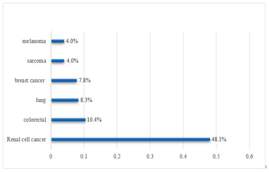 Global studies have shown that the most common primary tumors of secondary thyroid neoplasms in autopsy originate from the lung, breast, kidney, and colorectal cancer, while in the clinic, renal cell carcinoma is the most common, followed by colorectal cancer and lung cancer, which may be due to the more aggressive nature of lung malignant tumors [1,5,9]. Domestic studies have shown that metastases to the thyroid gland are most commonly derived from lung cancer, followed by breast cancer and gastric cancer [16,24]. This difference is probably caused by the difference in tumor incidence and primary tumor invasiveness at home and abroad. Histologically, adenocarcinoma and squamous cell carcinoma are the main histological types of primary tumors [5]. A recent review estimated the frequency of metastasis of related malignant tumors to the thyroid gland to be 48% in renal cell carcinomas, 10% in colorectal cancers, 8% in lung cancers, and 8% in breast cancer [23] (Figure 1).