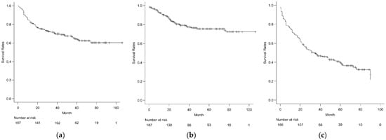 Of the 187 patients, the 3-year OS and LC rates were 71.7% (95% confidence interval (CI) 64.6–77.7%), and 79.1% (95% CI 71.9–84.7%), respectively (Figure 1a,b). Of the 166 M0 patients, the 3-year PFS was 48.6% (95% CI 40.8–56.0%) (Figure 1c). In addition, of the 166 M0 patients, local recurrence occurred in 37 patients (22.3%) at a mean of 19 months (range of 0–76 months) and distant metastasis occurred in 71 patients (42.8%) at a mean of 14.5 months (range of 0–78 months) after the initial treatment. In the histological analyses, the 3-year OS rates for chordoma, chondrosarcoma, and osteosarcoma were 93.9% (95% CI 82.3–98.0%), 85.2% (95% CI 68.0–93.6%), and 49.1% (95% CI 30.8–65.1%), respectively (Figure 2a). The 3-year LC rates for chordoma, chondrosarcoma, and osteosarcoma were 80.7% (95% CI 67.1–89.1%), 90.2% (95% CI 72.5–96.7%), and 70.1% (95% CI 46.2–84.9%), respectively (Figure 2b). Regarding LC rates, no significant difference among the three histological subtypes was observed. The 3-year PFS rates for chordoma, chondrosarcoma, and osteosarcoma were 56.1% (95% CI 41.7–68.3%), 73.9% (95% CI 54.5–86.0%), and 24.1% (95% CI 10.7–40.5%), respectively (Figure 2c). Osteosarcoma had significantly worse OS and PFS compared to chordoma (p < 0.001) and chondrosarcoma (p < 0.001), respectively.