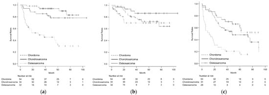 (a) The comparison of overall survival among the patients with chordoma, chondrosarcoma, and osteosarcoma; (b) the comparison of local control rates among the patients with chordoma, chondrosarcoma, and osteosarcoma; (c) the comparison of progression-free survival among the patients with chordoma, chondrosarcoma, and osteosarcoma.
