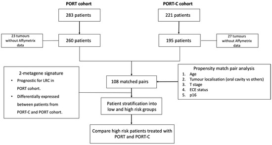 In this retrospective study, two cohorts with locally advanced HNSCC were included. In total, 221 patients were treated with PORT-C between 2004 and 2012 in 9 different institutions of the German Cancer Consortium—Radiation Oncology Group (DKTK-ROG) [28] and 283 patients were treated with PORT between 1999 and 2016 at the DKTK-ROG site in Dresden. All patients received surgery followed by postoperative radio(chemo)therapy and met the following inclusion criteria: histologically proven squamous cell carcinoma, curatively intended cisplatin-based PORT-C or PORT according to standard protocols covering the former tumour region and the neck nodes. Patients were excluded if whole-transcriptome data were not available, reducing the patient number to 195 in the PORT-C cohort and to 260 in the PORT cohort. Additional details on inclusion criteria, data collection, handling, and analyses of biomaterial have been described previously [28,29]. In this study, the 7th edition (2010) of the TNM classification has been used. The study design is illustrated in Figure 1.