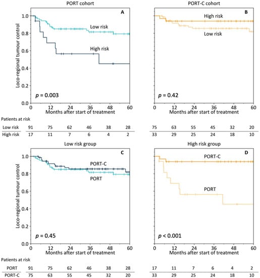 From the multivariable Cox regression model on the PORT cohort, an individual risk score (rs) was calculated for every patient: . Upregulation of both metagenes was related to reduced LRC. Patient stratification using the optimal risk score cut-off of 0.60 led to a significant difference in LRC for the PORT cohort (p = 0.003) but not for the PORT-C cohort (p = 0.42), Figure 2A,B. Comparing the patients classified to be at high risk between the two treatment types revealed a significant benefit of PORT-C (p < 0.001), while there was no difference between the patients classified to be at low risk (p = 0.45), Figure 2C,D. A multivariable model including the 2-metagene-classifier, treatment status, and their interaction term (gene classifier × treatment status) showed a statistically significant interaction term (p = 0.027, Table 2), i.e., the signature was predictive for the type of treatment. The interaction term remained significant when additional clinical characteristics were included in the model (p = 0.023, Table 2).