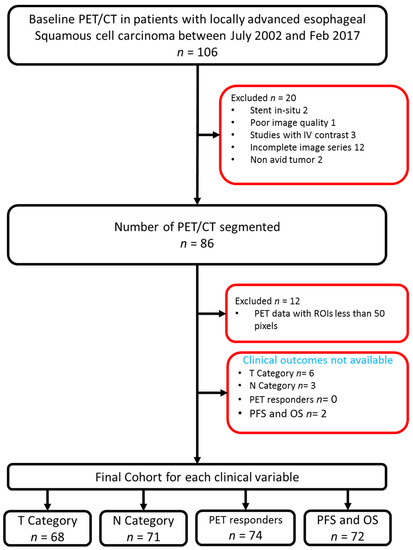 Positron emission tomography/computed tomography (PET/CT) with 18-fluorine-labeled fluorodeoxyglucose (18F-FDG) has become an established modality of investigation in the staging of patients with esophageal cancer, providing incremental information leading to changes in management for up to one third of patients [1]. It has been shown to provide valuable prognostic information prior to any treatment and during and after chemoradiotherapy [2,3]. Correlations between prognosis and various metabolic parameters such as standardized uptake value, total lesion glycolysis, and metabolic tumor volume have been reported in several studies [4,5,6,7]. Radiomics analysis allows us to use the diagnostic images further by extracting information otherwise “invisible” to the naked eye and thus potentially improve the diagnostic and prognostic accuracy of a given study [8,9]. It follows a complex workflow which includes image acquisition, preprocessing, region of interest (ROI) segmentation, feature extraction, and feature analysis [10]. In a meta-analysis, Park et al. highlighted that almost 90% of the radiomics analyses were conducted for oncological studies, and mainly utilized for diagnosis and grading of the tumor, molecular biology and genomics assessment, predicting survival outcomes, and treatment response [11].