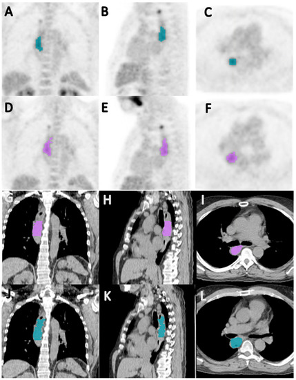 Coronal (A,D), sagittal (B,E), and axial (C,F) PET images, and coronal (G,J), sagittal (H,K), and axial (I,F) CT images showing segmentation of primary tumor by reader 1 (A–C,G–I) and reader 2 (D–F,J–L), in a 64-year-old male patient with esophageal squamous cell carcinoma; the Jaccard index and a dice similarity coefficient for inter-reader agreement on the segmented volumes were 0.657 and 0.793, respectively.