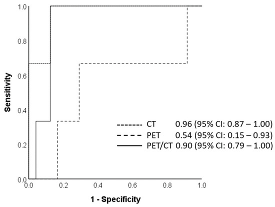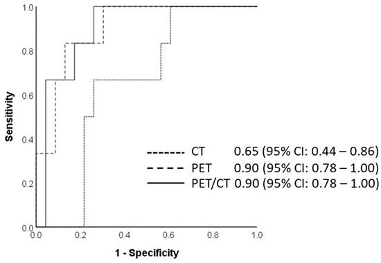 For the prediction of tumor category, the AUC of the training datasets for CT, PET, and combined PET/CT was 0.89, 0.90, and 0.87, respectively (Figure 3). The diagnostic accuracies of the test dataset for the prediction of tumor category were similar for CT, PET, and combined PET/CT datasets (70.4%, 70.4%, and 81.5%, respectively; p-value CT vs. PET/CT = 0.219, PET vs. PET/CT = 0.289, CT vs. PET = 1.000). The AUC for the CT and combined PET/CT test datasets was above 90% (0.96 for CT test and 0.90 for the PET/CT test). All three models, however, demonstrated a poor negative predictive value.