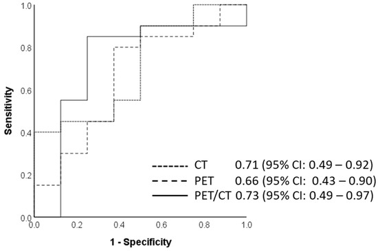 For the prediction of nodal status, the AUC for the CT, PET, and PET/CT training datasets was 0.75, 0.98, and 0.93, respectively. The PET and the combined PET/CT test datasets showed higher accuracy (86.2% each) and had a similar AUC of 0.90 compared to the CT test dataset (Figure 4). There was no improvement in the accuracy when CT or PET datasets were compared to the PET/CT datasets (p-value CT vs. PET/CT = 0.109, PET vs. PET/CT = 1.000). There was, however, a trend towards significance between the PET and the CT data (p-value = 0.070). The combined PET/CT dataset had a better specificity than the PET dataset alone (66.7% vs. 33.3%).