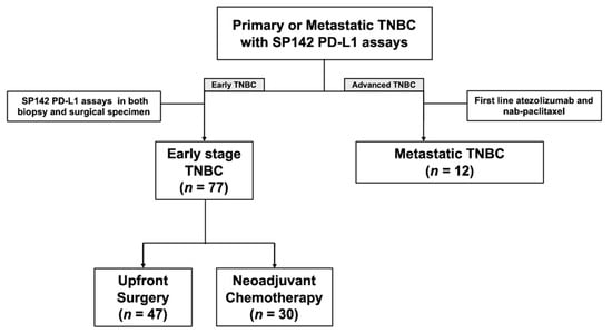We obtained approval from the institutional review board which adheres to the Good Clinical Practice guidelines under the Declaration of Helsinki. Subsequently, through a retrospective search of our pathology database, we retrospectively identified all the patients at Gangnam Severance Hospital, Yonsei University College of Medicine, Seoul, Korea, between 1 January 2016 and 30 June 2021, with TNBC whose primary, recurrent, or metastatic breast cancer were subjected to the VENTANA SP142 PD-L1 assay. Seventy-seven patients whose PD-L1 status were evaluated more than twice in primary tumors with different sample types (biopsy and surgical specimens) were included. Of these patients, 47 underwent upfront surgery and 30 underwent neoadjuvant chemotherapy (NACT) between biopsy and surgery. Since June 2019, 12 patients with PD-L1+ mTNBC received atezolizumab and nab-paclitaxel as their first line of treatment. Figure 1 presents a summary of our patients.