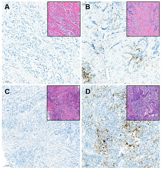 Representative cases for SP142 PD-L1 immunohistochemistry in tumors with variable tumor-infiltrating lymphocytes levels (×100 magnification): (A) Negative PD-L1 in the low-tumor-infiltrating lymphocyte (TIL) tumor; (B) Positive PD-L1 in the low-TIL tumor; (C) Negative PD-L1 in the high-TIL tumor; (D) Positive PD-L1 in the high-TIL tumor; Inlet pictures present the matched area of H&E images. The cutoff of TIL for the low- and high-TIL groups was defined as 20% in this study.