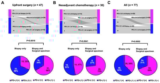 PD-L1 status between biopsied and surgical samples (tops) or rate of PD-L1 positive according to multiple samples (bottom): (A) Upfront surgery group: PD-L1-positive rates significantly increased from 32% to 66% (p = 0.0018, Student’s t test); (B) Neoadjuvant chemotherapy group: PD-L1-positive rates tended to be increased from 47% to 73% (p = 0.0641, Fisher’s exact test); and (C) All patients: PD-L1-positive rates were significantly increased from 38% to 69% (p = 0.0002, Fisher’s exact test).
