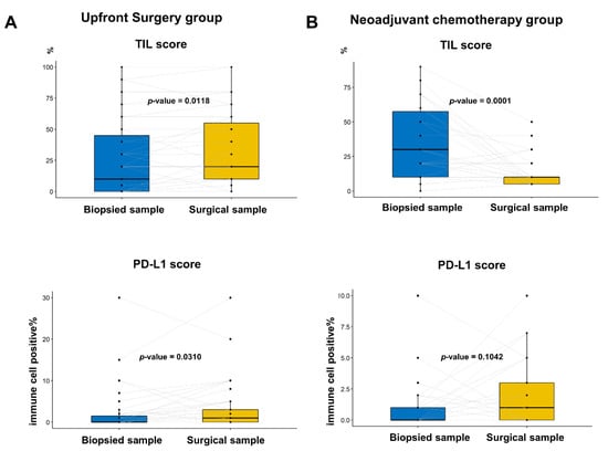 Comparison of percentage PD-L1 score and tumor-infiltrating lymphocyte (TIL) between the paired biopsied and surgical samples in the same patients: (A) In the group with upfront surgery, the TIL and PD-L1 score was significantly higher in the surgical samples than in biopsied samples (p = 0.0118 and p = 0.0310, respectively; paired t test); and (B) In the group with neoadjuvant chemotherapy, the TIL score was significantly lower in surgical samples than in biopsied samples, whereas the PD-L1 score tended to be elevated without statistical significance (p = 0.0118 and p = 0.310, respectively; paired t test).