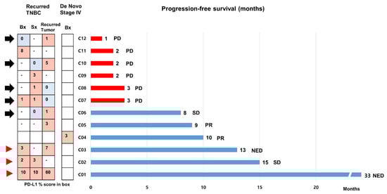 Progression-free survivals of 12 patients with metastatic triple-negative breast cancer treated with first line atezolizumab and nab-paclitaxel. We assessed the progression-free survival (PFSs) of 12 patients with metastatic triple-negative breast cancer (mTNBC) who received first line atezolizumab and nab-paclitaxel using a bar chart. Eleven patients had relapsed mTNBC, except for one patient with de novo mTNBC. Of these, SP142 PD-L1 assays were performed at least twice using archival tissues from primary or recurrent tumors in 7 patients. The black arrow indicates cases with heterogeneity in PD-L1 status across the samples. PFSs were longer than 12 months in 3 patients who had strong, constant PD-L1 positivity across multiple samples (red arrowhead). Abbreviations: NED, no evidence of disease; PD, progression of disease; PR, partial response; SD, stable disease.