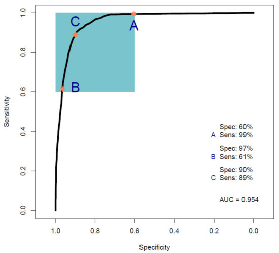 Receiver operating characteristic (ROC) curve analysis calculated from a partial least squares discriminant analysis (PLS-DA) model performed on Cohort A. The colored box indicates the region with sensitivity and specificity greater than 60%. The orange dots indicate the points within that region that have maximum sensitivity (A), maximum specificity (B), and balanced sensitivity and specificity (C) (Sens, sensitivity; Spec, specificity; AUC, area under the ROC curve).