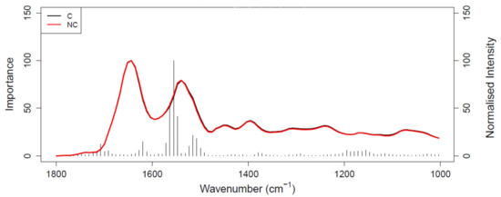 Vibrational spectroscopy has gained increasing interest in recent years for the clinical diagnosis/detection of diseases such as sepsis [13], malaria [14,15], and several types of cancers [11,16], employing minimally invasive techniques for detection thanks to the use of small portions of tissues, cells, and/or biofluids—such as saliva, blood plasma, and serum [11,17]. Both Raman and infrared (IR) spectroscopy have displayed their potential for use in the clinical field through a vast amount of research and proof-of-concept studies [10,11,12,16], although not many studies have had a significant number of patients (above 25 cases) in both the disease and control groups [16].