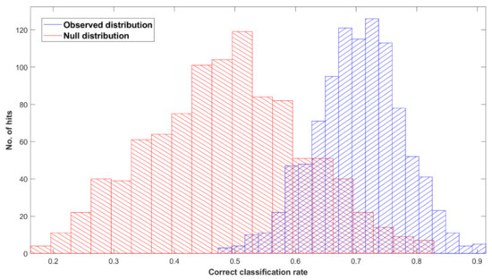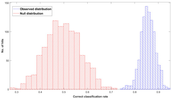 Permutation tests’ output plot; null (red) and observed (blue) distribution classification rated for Cohort A with a partial least squares discriminant analysis (PLS-DA) classification model after 1000 bootstraps, using pre-processed spectra.
