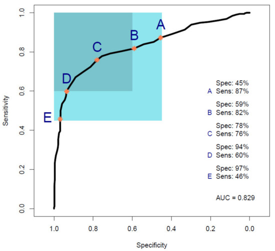 Receiver operating characteristic (ROC) curve analysis calculated from a partial least squares discriminant analysis (PLS-DA) model performed on Cohort B. Point A shows the point of maximum sensitivity and point E shows the point of maximum specificity when the model is tuned to give a specificity or sensitivity of 45%, respectively, as highlighted by the light blue square. Point B shows the point of maximum sensitivity and point D shows the point of maximum specificity when the model is tuned to give a specificity or sensitivity of 60%, respectively, as highlighted by the darker light blue square. Point C represents the balance point between sensitivity and specificity, whilst remaining in the target regions (Sens, sensitivity; Spec, specificity; AUC, area under the ROC curve).