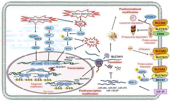 Recently, studies have found that the posttranslational regulation of SLC7A11 modulates downstream biological effects (Figure 2). The SLC7A11 protein could be degraded by autophagy and the ubiquitin–proteasome system. High cell density inactivates mammalian target of rapamycin (mTOR) and promotes the lysosomal degradation of SLC7A11, leading to improved GBM cell viability under glucose-limited conditions [87]. mTOR phosphorylates and sequesters helix–loop–helix transcription factor EB to inhibit lysosomal gene expression [88,89], and controls lysosomal functions through ATP-sensitive Na+ channels [90]. Although there is a close relationship between mTOR activity and lysosomal function, how mTOR is regulated and how SLC7A11 is delivered to lysosomes in response to cell density in GBM cells should be investigated in future studies. The tumour stem cell molecules CD44 [91,92,93] and OTU deubiquitinase ubiquitin aldehyde binding 1 (OTUB1) [94] were beneficial to the stability of SLC7A11 on the cell membrane, and inhibited the proteasomal degradation of SLC7A11. Protein–protein interactions also regulate SLC7A11 function. Beclin 1 (BECN1) inhibits system xc− activity through direct binding to SLC7A11, but not through SLC7A11 expression [95]. SLC7A11 is a new UFMylation substrate, and ubiquitin-fold modifier 1 (UFM1) increases its protein stability in a posttranscriptional manner. UFM1/SLC7A11 may be a new potential anticancer target, but how UFM1 acts on SLC7A11 remains an unanswered question [96].