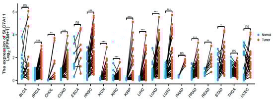 SLC7A11 expression in tumour and normal paired tissues was obtained from pan-cancer data of the Cancer Genome Atlas (TCGA). ns, p ≥ 0.05; *, p < 0.05; **, p < 0.01; ***, p < 0.001. BLCA: bladder cancer; BRCA: breast invasive carcinoma; CHOL: cholangiocarcinoma; COAD: colon adenocarcinoma; ESCA: oesophageal carcinoma; HNSC: head and neck squamous-cell carcinoma; KICH: kidney chromophobe; KIRC: kidney renal clear-cell carcinoma; KIRP: kidney renal papillary-cell carcinoma; LIHC: liver hepatocellular carcinoma; LUAD: lung adenocarcinoma; LUSC: lung squamous-cell carcinoma; PAAD: pancreatic adenocarcinoma; PRAD: prostate adenocarcinoma; READ: rectum adenocarcinoma; STAD: stomach adenocarcinoma; THCA: thyroid carcinoma; UCEC: uterine corpus endometrial carcinoma.