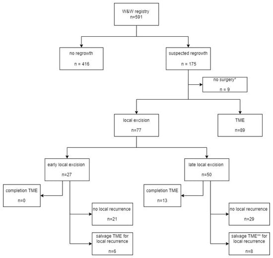 Regrowth during follow-up in the W&W program was preferably proven by biopsy, but sometimes there were only suspicious findings on endoscopy or MRI. Patients were offered TME as the standard treatment option, and LE by performing transanal endoscopic microsurgery (TEM) or transanal minimally invasive surgery (TAMIS) if the local regrowth was small and without signs of involved lymph nodes on MRI (or as a diagnostic procedure when the regrowth was not proven). Ultimately, the choice between TME or LE depended on the patient’s preference, comorbidities, and the advice of the multidisciplinary team. When patients underwent LE for regrowth, and the histological examination of the resection specimen showed ypT0 or ypT1 with free resection margins (>1 mm), the patients continued follow-up in the W&W protocol. Completion TME was advised when the resection specimen showed ypT2–3 or an irradical resection (i.e., microscopic margin involvement with the tumor either laterally or at a deep resection surface (R1), or a too-fragmented resection specimen).