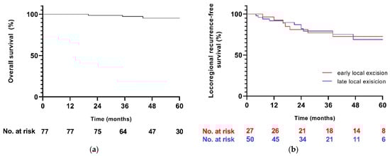 Kaplan–Meier curves for (a) overall survival and (b) locoregional-recurrence-free survival for the early and late local excision groups.