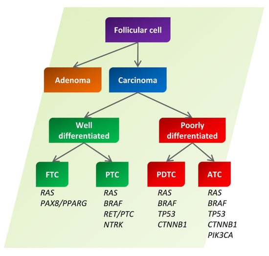 Most thyroid neoplasias originate from genetic alterations of follicular cells. From these cells derive benign follicular adenomas (FTA) and thyroid carcinomas (TC), which can be further subdivided into well-differentiated (WDTC) and poorly differentiated (PDTC) ones. Among the former, we can include papillary (PTC, 80% of TCs) and follicular (FTC, 10% of TCs) carcinomas of the thyroid, while, among the latter, we can include PDTC and undifferentiated ones, also called anaplastic carcinomas (ATC, 2–5% of TCs) [1] (Figure 1).