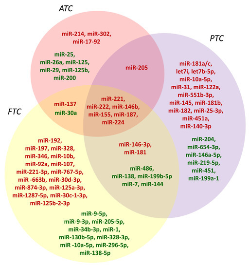 The landscape of miRNAs differentially expressed in the diverse histotypes of thyroid-follicular-cell-derived carcinomas. Upregulated miRNAs are indicated in red, while downregulated ones are indicated in green. FTC, follicular thyroid carcinoma; PTC, papillary thyroid carcinoma; ATC, anaplastic thyroid carcinoma.