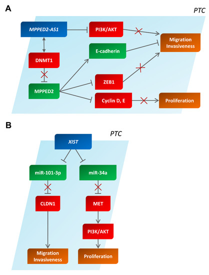 The involvement of MPPED2-AS1 and XIST in human papillary thyroid carcinoma. Schematic representation of several interactions explaining the role of MPPED2-AS1 (A) and XIST (B) in human papillary thyroid carcinomas. In red and in green, partners with an oncogenic or anti-oncogenic behavior are reported, respectively. PTC, papillary thyroid carcinoma.