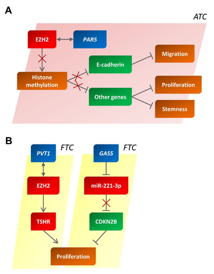 | PAR5 | ↓ | ↔ EZH2 → ↓ E-cadherin | Proliferation | ATC | [97] |