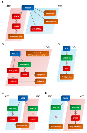 | UCA1 | ↑ | ↓ miR-204 → ↑ BRD4 | Proliferation | PTC | [103,104,105] |