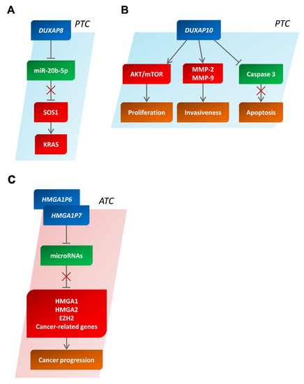 For a long time, it was erroneously believed that they were nonfunctional entities, but it was very recently shown that they have key roles in various cell activities, such as cell growth and invasion, and their deregulation has been described in several cancers, including TC development [26,27,28]. Indeed, it has been reported that pseudogenes carry in their sequence elements responsive to miRNAs, and this peculiarity allows them to indirectly regulate the expression of the corresponding genes, subtracting a significant number of miRNAs from the cell pool and then behaving as competitive endogenous RNAs (ceRNAs) [29,30,31].