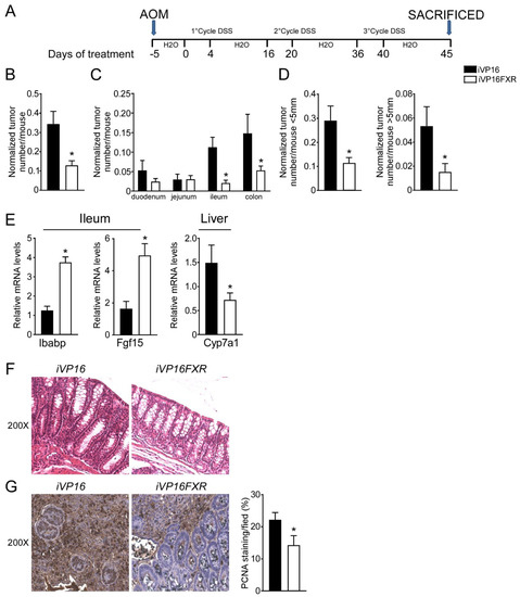 Intestinal constitutive FXR activation protects from AOM/DSS-induced colorectal cancer. (A) Schematic representation of AOM/DSS administration. AOM (12 mg/Kg) is injected on day 0. 5 days later, DSS solution is administered to mice in drinking water. 5 days of DSS treatment is followed by 16 days of drinking water. This cycle was repeated a total of 3 times. (B) Total number of tumors was counted in iVP16 and iVP16FXR mice. The diameter of each tumor was measured. Normalized tumor number/mouse of iVP16 and iVP16FXR mice (n = 13 iVP16 and n = 20 iVP16FXR). (C) The entire length of the intestine was analyzed for tumor formation (n = 13 iVP16 and n = 20 iVP16FXR). (D) Normalized number of tumors <5 mm and >5 mm per mouse from intestine of iVP16 and iVP16FXR mice (n = 13 iVP16 and n = 20 iVP16FXR). (E) Gene expression analysis of FXR target genes in iVP16 and iVP16FXR mice. Cyclophilin was used as a housekeeping gene to normalize data (n = 13 iVP16 and n = 20 iVP16FXR). (F) Histology of colonic specimens of iVP16 and iVP16FXR mice was assessed by H&E staining and was observed by light microscopy (magnification, 200×) (n = 5 iVP16 and n = 5 iVP16FXR). Representative specimens are shown. (G) Paraffin-embedded tumor specimens from iVP16 and iVP16FXR mice were immunoassayed with anti-PCNA antibody (200×-magnification) (n = 5 iVP16 and n = 5 iVP16FXR). Representative specimens are shown. PCNA staining per field was quantified by ImageJ software and reported as percentage per field. Results are the mean ± SEM, * p ≤ 0.05 Statistical significance was assessed by Student’s t-test (* p < 0.05).