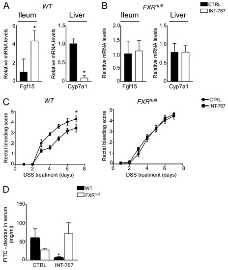 We have previously shown an INT-767-dependent FXR activation when administered long term (12–14 months) in a rodent diet [41]. To study the therapeutic potential of the FXR-agonist INT-767 in intestinal inflammation in a preventive fashion, a diet-enriched with this compound was administered to mice for 5 weeks prior DSS to evaluate FXR activation via a short-term administration of INT-767 in a rodent diet. We assessed FXR transcriptional activation in the gut-liver axis in our short-term dietetic protocol. In the ileum, WT mice administered with INT-767 displayed a significant up-regulation of FGF15 expression. This, in turn, translated into a down-regulation of Cyp7a1 in the liver. INT-767-dependent FXR activation did not occur in Fxrnull mice (Figure 2A,B).