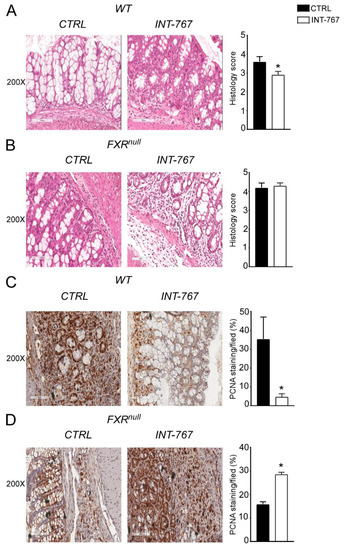 INT-767 protects from DSS-induced colitis. Histology of colonic specimens of (A) WT and (B) Fxrnull mice fed with or without INT-767 was assessed by H&E staining and was observed by light microscopy (magnification, 200×; n = 5 WT CTRL and n = 5 WT INT-767; n = 5 Fxrnull CTRL and n = 5 Fxrnull INT-767). Representative specimens are shown. Histology score of inflammation was calculated using an established semiquantitative score ranging from 0 to 6 based on infiltration of inflammatory cells and epithelial damage. Paraffin-embedded tumor specimens from (C) WT and (D) Fxrnull mice fed with or without INT-767were immunoassayed with anti-PCNA antibody (200× magnification; n = 5 WT CTRL and n = 5 WT INT-767; n = 5 Fxrnull CTRL and n = 5 Fxrnull INT-767). Representative specimens are shown. PCNA staining per field was quantified by ImageJ software and reported as percentage per field. Results are the mean ± SEM. Statistical significance was assessed by Student’s t-test (* p < 0.05).