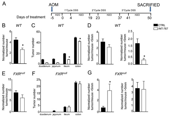 Clinical and experimental evidence have shown that chronic intestinal inflammation plays a crucial role in colorectal carcinogenesis. Indeed, patients affected by IBD present an increased risk of developing intestinal tumors. In these patients, colitis-associated cancer risk correlates with the severity and duration of active disease [9]. Moreover, studies in rodent models of intestinal cancer and human epidemiologic studies have linked elevated fecal concentration of secondary BAs to an increased incidence of colorectal cancer [11,12]. In the DSS model described in Figure 2 and Figure 3, the inflammation-dependent proliferating capacity was assessed by analyzing protein expression of a regulator of cell cycle progression, PCNA, in the distal colon of mice subjected to the chemically-induced colitis. DSS promoted proliferation in both WT and Fxrnull mice administered with control diet. Conversely, WT mice administered with INT-767-enriched diet displayed 70% less PCNA staining compared to the control group, while no changes were recorded in Fxrnull mice (Figure 3C,D). Therefore, we moved on to a chemically-induce inflammation driven intestinal neoplasia model and studied whether the INT-767-enriched diet has a role in protecting from colorectal tumorigenesis via pharmacological Fxr activation. Thus, we performed an intraperitoneal injection of AOM followed by three subsequent administrations of DSS (Figure 4A). AOM-DSS experimental treatment in WT mice fed with the control diet caused tumor development (Figure 4B), characterized by a progressively increasing number of tumors moving along the different segments of the intestinal tract (Figure 4C). INT-767 administration in WT mice counteracted this and a reduction in tumor number per mouse was observed (Figure 4B,C). Notably, stratifying the tumor/mouse according to tumor size, a striking decrease in tumor number with a diameter larger than 5mm was recorded for WT mice fed with INT-767-enriched diet compared to controls (Figure 4D). No differences were found in Fxrnull mice (Figure 4E–G).