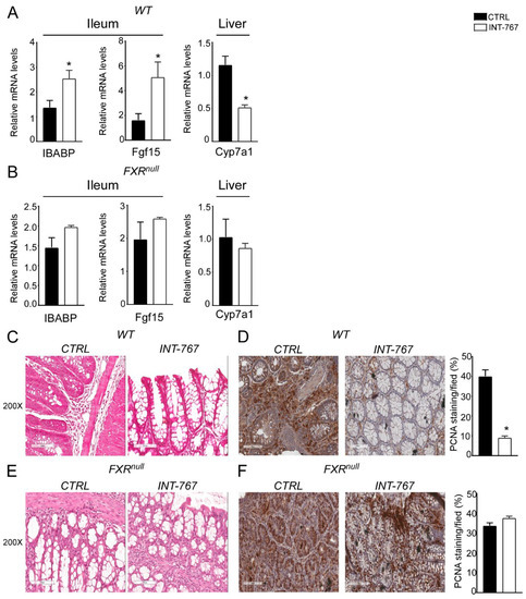 To verify Fxr activation via INT-767 oral administration, we analyzed intestinal and hepatic Fxr target genes. In the ileum of WT mice, INT-767 activated Fxr to induce the expression of IBABP compared to control diet (Figure 5A). Moreover, activated Fxr in the ileum induced the expression of Fgf15 which, in turn, resulted in Cyp7a1 hepatic downregulation (Figure 5A). Conversely, no hepatic nor intestinal Fxr target gene expression was induced by INT-767 in Fxrnull mice (Figure 5B).