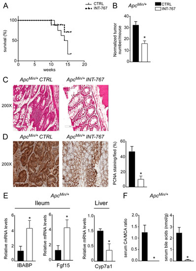 About 20% of colorectal cancer cases have a genetic base [3] as it occurs in FAP patients, a syndrome caused by a mutation in the APC gene. Typically, FAP patients display an early development of multiple polypoid tumors already at a young age. A murine genetic model of this disease, the ApcMin/+ mouse, is available [38,39]. ApcMin/+ mice carry a truncated mutation of the tumor suppressor APC gene which causes spontaneous development of intestinal tumors in mice, starting at 4 months of age. In ApcMin/+ mice, tumors spontaneously develop from precursor lesions, known as aberrant crypt foci, to polypoid adenomas and they appear primarily in the small intestine and at later stages within the colon. We have previously shown that Fxr expression is lower in both ApcMin/+ mice and in FAP patients’ tumors compared to the macroscopically normal adjacent mucosa [36]. Moreover, lack of FXR in both ApcMin/+ and in the AOM-DSS model of inflammation-driven intestinal tumorigenesis, leads to early mortality and faster tumor progression. On this background, the potential effect of FXR activation via administration of a diet enriched in INT-767 has also been studied in ApcMin/+ mice. First of all, mortality assessment showed that ApcMin/+ mice fed with INT-767 had 70% reduction in mortality rate compared to mice fed with the control diet (Figure 6A). Furthermore, a significant reduction in normalized tumor number in ApcMin/+ mice fed with INT-767 diet compared to control group was observed (Figure 6B). Subsequently, histological (H&E) and immunohistochemical (PCNA) analyses were performed on colonic sections. H&E staining showed a preserved intestinal morphology compared to mice fed with control diet (Figure 6C). Moreover, a lower PCNA signals was observed in ApcMin/+ mice fed with INT-767 diet compared to the control group (Figure 6D). To assess whether the antitumoral effect of INT-767 was induced via Fxr activation in the gut-liver axis and the consequent reshape of BA homeostasis, FXR target gene expression and serum BA pool size and composition were analyzed. In the ileum, a significant up-regulation of Ibabp was observed in ApcMin/+ fed with INT-767-enriched diet compared to controls (Figure 6E). Fgf15 expression was also induced by INT-767-dependent activation of Fxr, which in turn resulted in hepatic downregulation of Cyp7a1 (Figure 6E). Consequently, this caused a marked decrease in serum BA levels in mice fed with INT-767 diet and a shift of serum BA composition to a more hydrophilic profile due to the enrichment of β-muricholic acid (MCA) in the BA pool, as indicated in the graph reporting CA/MCA ratio, compared to controls (Figure 6F). We do not provide the difference in Cyp7a1 protein levels, and we recognized this is a limitation of the study although the reduction of serum BA concentration and serum CA/MCA ratio represents its functional readout.