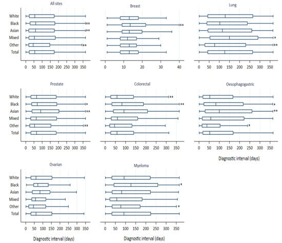 Site-specific box and Whisker plots showing ethnic differences in the number of days to diagnosis (lower adjacent value, 25th, 50th, and 75th centiles, and upper adjacent value). Figures are the exact number of days from index feature to diagnosis. Asterisks indicate significant ethnic differences in DI compared with the White group: (** p-value ranges from 0.001 to 0.004) (* p-value ranges from 0.01 to 0.05).