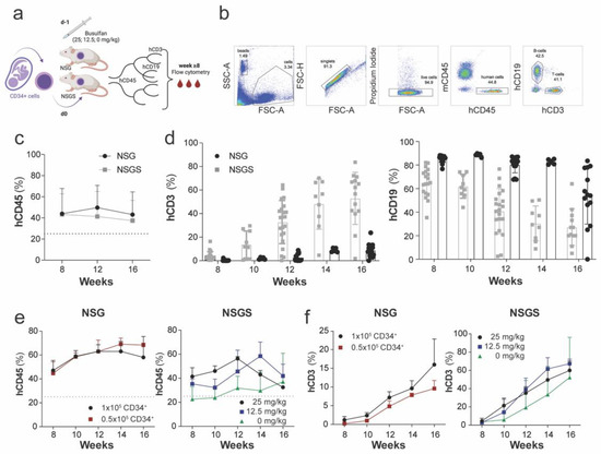 Reconstitution of the peripheral human immune system in NSG and NSGS mice. (a) Experimental design: Humanized NSG and NSGS mice were generated by preconditioning with different concentrations of busulfan at day –1, then 0.5–1 × 105 CD34+ cells isolated from the umbilical cord were injected intravenously on day 0. Blood samples were drawn regularly between week 8–16 post-engraftment. (b) Gating strategy used to define the level of chimerism and T cell development in mouse blood by flow cytometry. (c) Longitudinal measurement of human leukocyte frequency in NSG (n = 26) and NSGS (n = 26) mice. (d) Composite data of T cell (left) and B cell (right plot) development in representative NSGS mice (n = 25) and NSG (n = 15) over time. (e) Human leukocyte frequency was compared in NSG mice engrafted with 0.5 × 105 (n = 3) and 1 × 105 (n = 3) CD34+ cells and between different busulfan concentrations in NSGS mice (n = 3/group). (f) Within the human CD45+ leukocyte population, the frequency of CD45+CD3+ lymphocytes was determined.