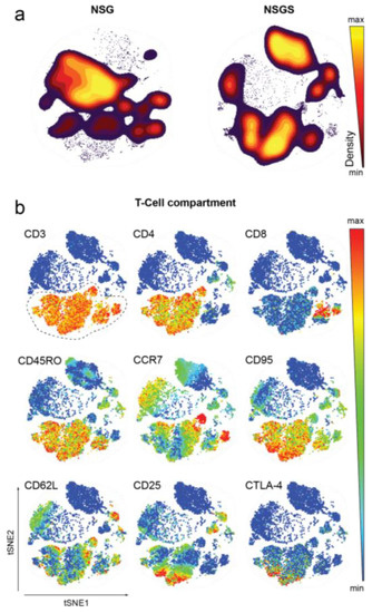 Characterization of peripheral T cells in NSG and NSGS mice with mass cytometry. (a) Contour density plots of viSNE maps showing the frequency of human immune cell populations in NSG (n = 3) and NSGS (n = 3) peripheral blood. (b) Phenotypic profiling of the T cell compartment shown for a representative NSGS recipient. The viSNE dot plots are colored according to T cell lineage and activation marker intensity. All marker expression levels are represented from high (red) to low (blue).