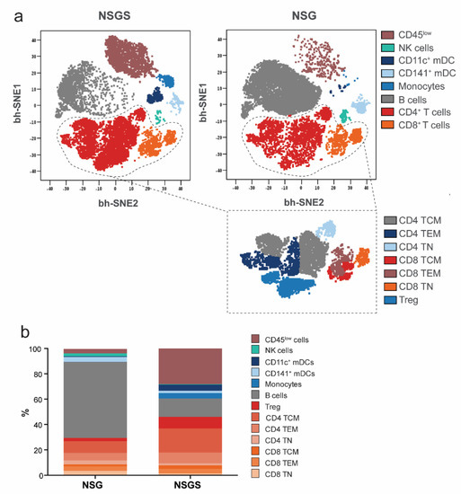 Characterization of peripheral human immune cell subsets in NSG and NSGS mice with mass cytometry. (a) Overlay of manually gated cell clusters on viSNE maps. (b) Comparisons of all immune cell subset frequencies from NSG and NSGS humanized mice (n = 3/each). T cell differentiation defined as: naïve (TN), CD45RO− CD95− CCR7+ CD62L+; central memory (TCM), CD45RO+ CD95+ CCR7+ CD62L+; effector memory (TEM), CD45RO+ CD95+ CCR7− CD62L−; regulatory T cell (Treg), CD4+ CD127− CD25+ CTLA-4+.