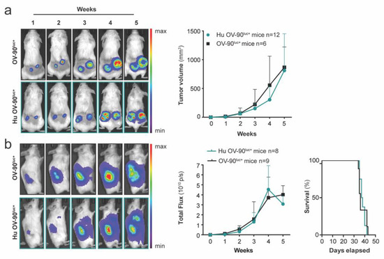Humanized mice support the engraftment of subcutaneous and orthotopic epithelial ovarian cancer cells (a) Humanized (hu) and immunodeficient mice were engrafted subcutaneously with 5 × 106 OV-90luc+ cells (n =12, hu OV-90luc+ mice; n = 6, OV-90luc+ mice). Tumor growth was monitored by in vivo bioluminescence imaging and caliper measurements ((height × width × length × П)/6). (b) Orthotopic OV-90luc+ xenografts (n = 8, hu OV-90luc+ mice; n = 9 OV-90luc+ mice) were imaged once a week and total flux was calculated. Survival of orthotopic xenografts is presented as days after implantation of 1 × 105 OV-90luc+ tumor cells. All optical images are presented as the minimum-to-maximum bioluminescence intensity for each mouse.