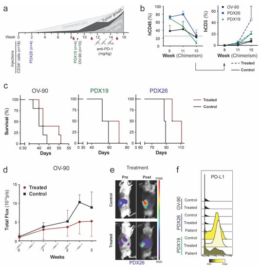 We previously demonstrated that reconstituted activated T cells express PD-1 (Supplementary Figure S2c). We evaluated chimerism and the frequency of T cells in the blood pre and post-nivolumab treatment (Figure 5b). Mice were allocated to treatment and control arms based on 11-week chimerism and T cell levels. All mice responded to nivolumab with progressive disease. However, survival in all three models was prolonged (control, 54.4 ± 20.2 days; treated, 61.9 ± 26.0 days) (Figure 5c). BLI of nivolumab treated OV-90luc+ hu mice (n = 5) indicated a decrease in tumor burden compared to the untreated control cohort (n = 5) (Figure 5d, Supplementary Figure S3a) and prolonged survival by 5 days (disease latency 43 ± 4). Two non-hu OV-90luc+ mice treated with nivolumab (n = 2) showed comparable disease latencies to hu OV-90luc+ untreated control mice, indicating that the treatment effect may be dependent on a functional human immune system (Supplementary Figure S3b). The benefit of anti-PD-1 targeted immunotherapy was also observed in hu PDX mice as a reduction in fluorescence signal intensity (Figure 5d,e). At the humane endpoint, both PDX models showed disseminated disease to the omentum, liver, diaphragm, mesentery, spleen and ascites, in both treatment and control arm (Supplementary Figure S3c). Survival was prolonged by 17 days in PDX26 (disease latency 96 ± 11 days) and 6 days in PDX19 (disease latency 59 ± 9 days) but this was not statistically significant (Figure 5c). PD-L1 expression level is one of the leading biomarkers for predicting the response to ICI for various cancer types and is evaluated for stratification of EOC patients [9,35]. Therefore, we evaluated the correlation of PD-L1 expression on tumor cells with the response to nivolumab treatment. Tumor cells derived from PDX19 xenografts had increased PD-L1 expression on more than 75% of analyzed tumor cells (Figure 5f). The high expression of PD-L1 was confirmed for the original patient tumor (Figure 5f). In contrast, only around 0.7% of OV-90 and 2% of PDX26 tumor cells were positive for PD-L1 staining. High PD-L1 expression in hu PDX19 did not improve the efficacy of treatment, and in all three hu xenograft models, we observed no influence of PD-L1 expression on survival.