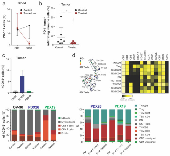 To assess immune modulation in response to ICI, we characterized the phenotypic composition of the immune cells in the blood and infiltrating the TME before and after treatment with a panel of 34 surface markers and mass cytometry. First, we identified a significant decrease in T cells expressing PD-1 in the peripheral blood after nivolumab treatment (n = 9); such a decrease was not observed in the control cohort (n = 8) (Figure 6a). When we assessed the tumor-infiltrating immune cells in the control and treated cohort, we identified a significant decrease in PD-1 expression for the entire immune cell population (CD45+ cells) in nivolumab-treated animals (Figure 6b). We then asked whether anti-PD-1 treatment affected tumor immunosuppression by measuring immune cell subset infiltration of the ovarian TME. The tumors in treated PDX xenografts showed increased infiltration by NK cells (Figure 6c). In addition, the number of tumor-infiltrating CD8 T cells did increase in the immune “hot” PDX26 model, a hallmark for the response to anti-PD-1 therapy [36]. Lastly, most tumor-residing immune cells belonged to the myeloid lineage. However, the generally low number of human tumor-infiltrating immune cells limits in-depth phenotypic characterization of these cells. The infiltration of CD45+ cells was additionally confirmed by IHC (Supplementary Figure S4). No differences between control versus treated xenograft tumors were observed. We confirmed that PD-1 is expressed on TEM and TCM in the blood of hu mice and assessed the effect of nivolumab treatment on T cells in the peripheral blood (Figure 6d). We could not identify any significant changes in the frequencies of human immune cell subsets in control and treated PDX blood samples (Figure 6d). Blood samples taken before treatment indicated differentiated T cells and an increased CD8:CD4 ratio compared to post-treatment. The composition of the immune system in OV-90luc+ hu mice changed over time and between control and treated animals (Supplementary Figure S5a,b). Specifically, the frequency of CD4 and CD8 T cells increased after anti-PD-1 treatment in the blood of OV-90luc+ hu mice.