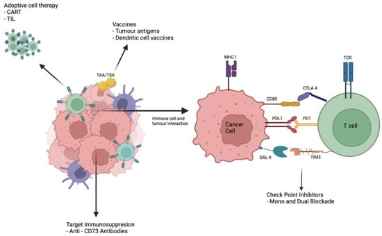 In the growing field of immunotherapy, researchers have expanded the potential treatment options to try and discover new treatments with a different mechanism of action to checkpoint inhibition. As mentioned above, the main tumour-specific antigen targets that are thought to be exploited through targeted immunotherapy are neoantigen proteins expressed solely by tumour cells that are generated from somatic mutations. Novel interventions that act to directly target neoantigen-specific responses, such as vaccination, are currently in development and have the ability to generate an anti-tumour response that is an alternative to releasing immune inhibition [69].