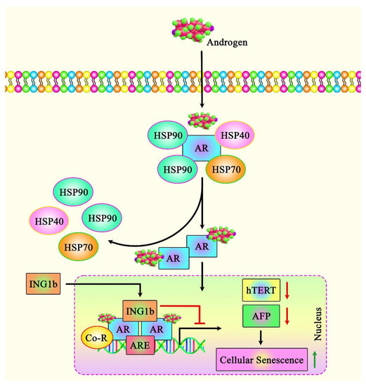 A schematic illustration of the functional interaction of ING1b with AR in prostate cancer (PCa). A recent study revealed that the tumor suppressor ING1b could play an essential role in attenuating cellular senescence in PCa cells by modulating AR signaling. In fact, ING1b could inhibit AR-responsive promoters as well as endogenous key AR target genes, including hTERT and AFP, thereby reducing tumor cell growth and migration [27].